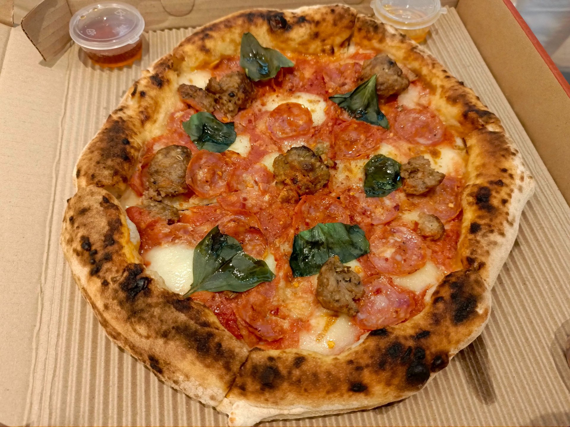 The Diavola pizza has a well-charred crust and a generous layer of toppings. Even as takeout, it holds its structure well. The spicy salami, Italian sausage, and dollops of ’nduja are visibly distributed across the surface, with melted fiordilatte blanketing everything underneath. The honey and chili flakes served on the side add a customizable element, letting you dial the heat up or balance it with sweetness.