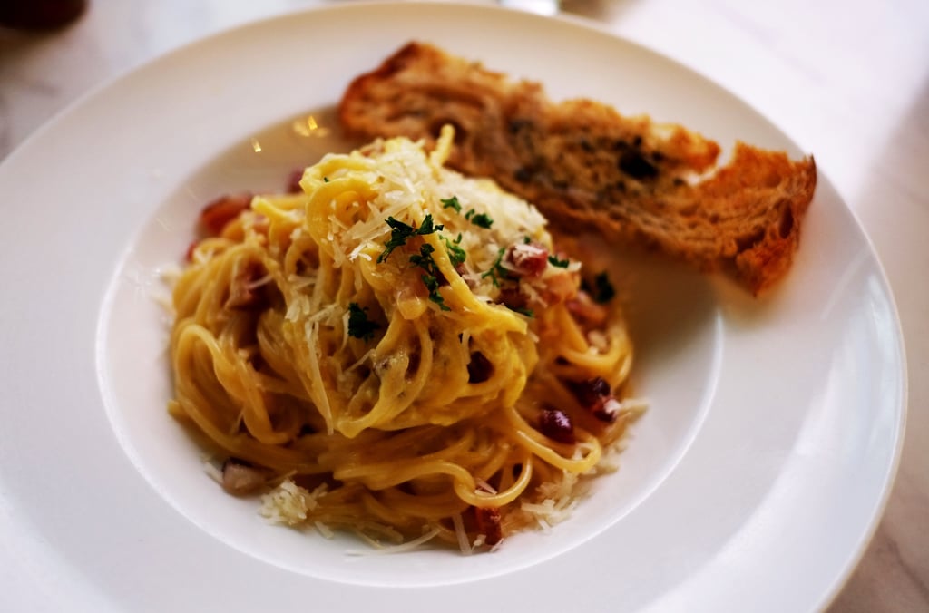 The Carbonara is understated in appearance. The light sauce blends with the mushrooms and bacon, giving the plate a simple, almost minimalist look. It is not visually striking, but it gives off a homey feel.