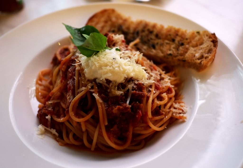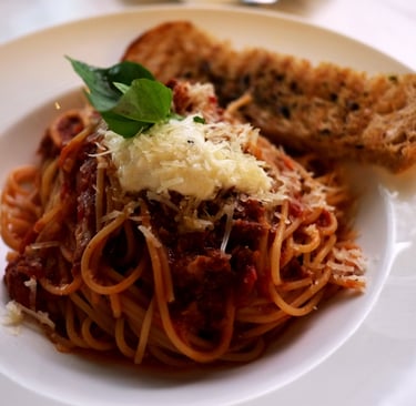 This Bolognese has a rich, brick-red finish that signals depth and slow cooking. The sauce clings to the thin spaghetti nicely, giving an appetizing sheen. The deep red color hints at slow-cooked richness, and the visible chunks of Angus beef add a rustic appeal and a visual texture that makes the plate look inviting.