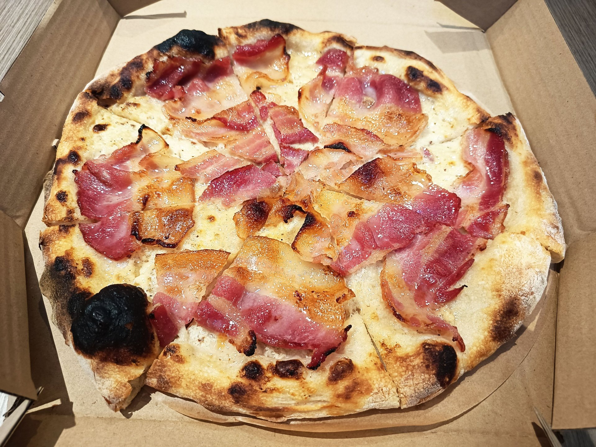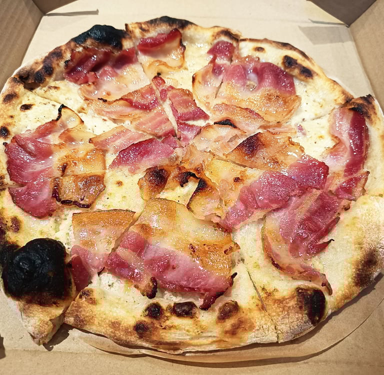 The generous bacon topping and beautiful char marks make this pizza as visually appealing as it is delicious.