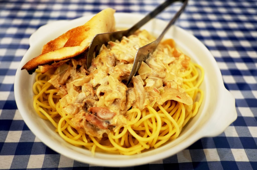 This dish has a generous, creamy appearance that makes it look instantly indulgent. The spaghetti is neatly coated in a pale, velvety sauce with visible pieces of tuna, herbs, and mushrooms. It looks full and comforting, like a dish that takes its time.