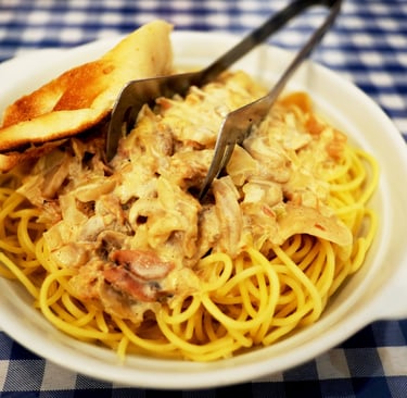 This is not your usual heavy cream-based pasta. It has a balanced flavor that starts smooth, then slowly builds up a mild heat from the spices. The tuna brings savory depth, and the mushrooms give a grounded, warm note. The spice lifts the flavor and prevents it from feeling too creamy. It tastes warm, savory, and comforting, with layers that develop gradually as you eat.