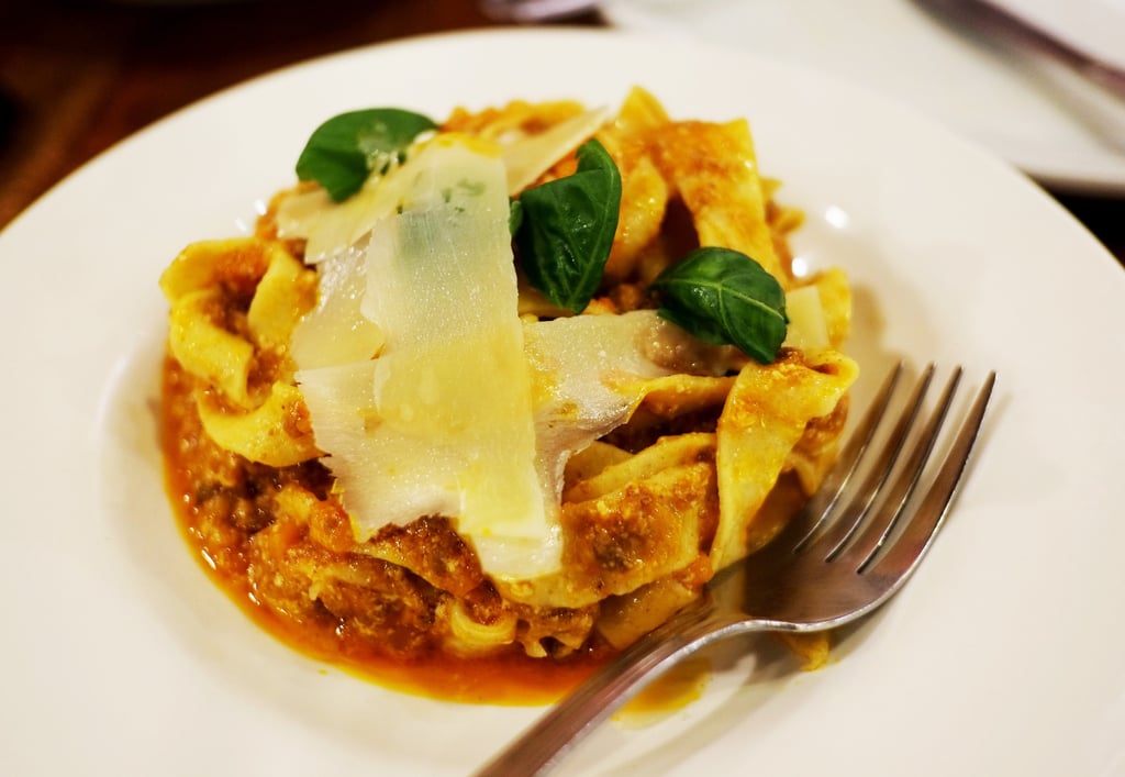 The Bolognese is plated in a manner reminiscent of fine dining. The flat pasta is carefully layered, topped with generous shavings of cheese and fresh herbs. The sauce pools subtly around the base, creating a vibrant contrast against the pale pasta. The presentation is clean, refined, and undeniably gourmet.