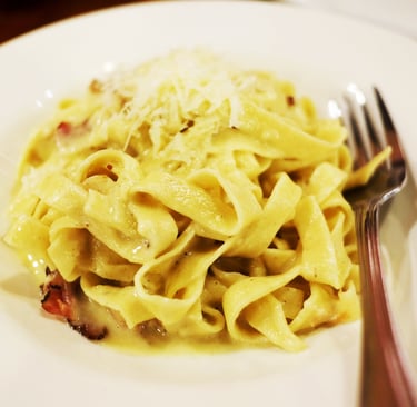 The Carbonara features handmade flat pasta coated in a light cream sauce and topped with grated cheese. The handmade texture of the pasta enhances its visual appeal. While not as striking as the Bolognese, it still looks appetizing and thoughtfully plated.