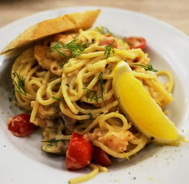 The dining area feels calm and intimate with its warm lighting and understated décor. It is welcoming without feeling crowded, giving diners a space to enjoy their meals slowly. The pasta dishes match the café’s personality with balanced flavors and welcoming simplicity. It is a reliable place for comforting, well prepared café food.