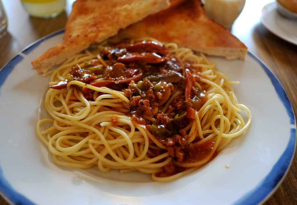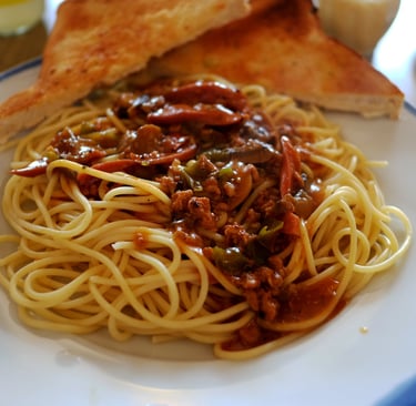 The presentation is very straightforward, resembling home cooked Filipino style spaghetti rather than an Italian pasta dish. The thick red sauce immediately stands out, with a color and consistency that feels nostalgic rather than refined.