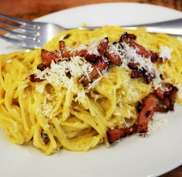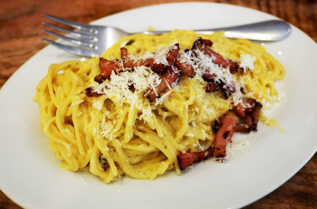 The Carbonara is served simply but attractively, letting the ingredients speak for themselves. The strands of pasta are glazed in a golden sauce, and visible bits of bacon add contrast. The grated cheese on top signals richness without overloading the plate. It looks inviting in a way that encourages you to mix and dive in.
