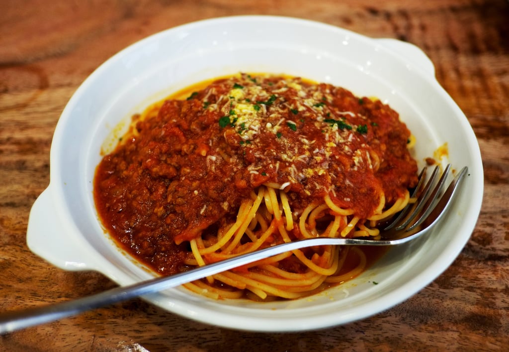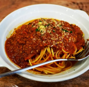 The aroma carries the warmth of tomato and herbs, with hints of garlic and olive oil rising from the plate. There is a faint savory depth from the meat that builds as you mix through the sauce. It has a familiar, home-cooked scent that signals a straightforward but thoughtfully prepared Bolognese.