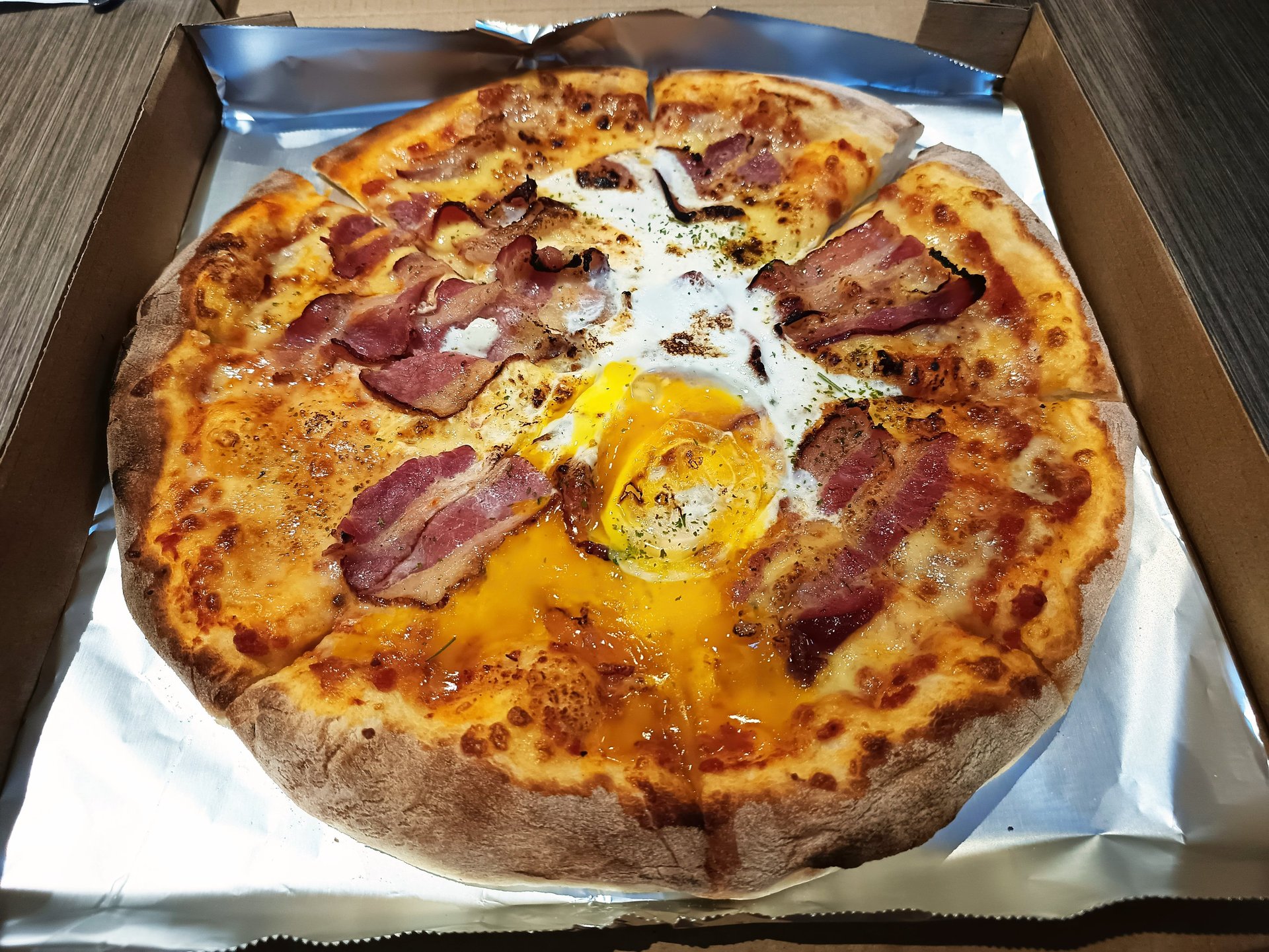 The crust does its job structurally. It supports the toppings well, holding together even with the weight of the egg and bacon. Each slice can be lifted without collapsing, which is no small feat given the topping load.