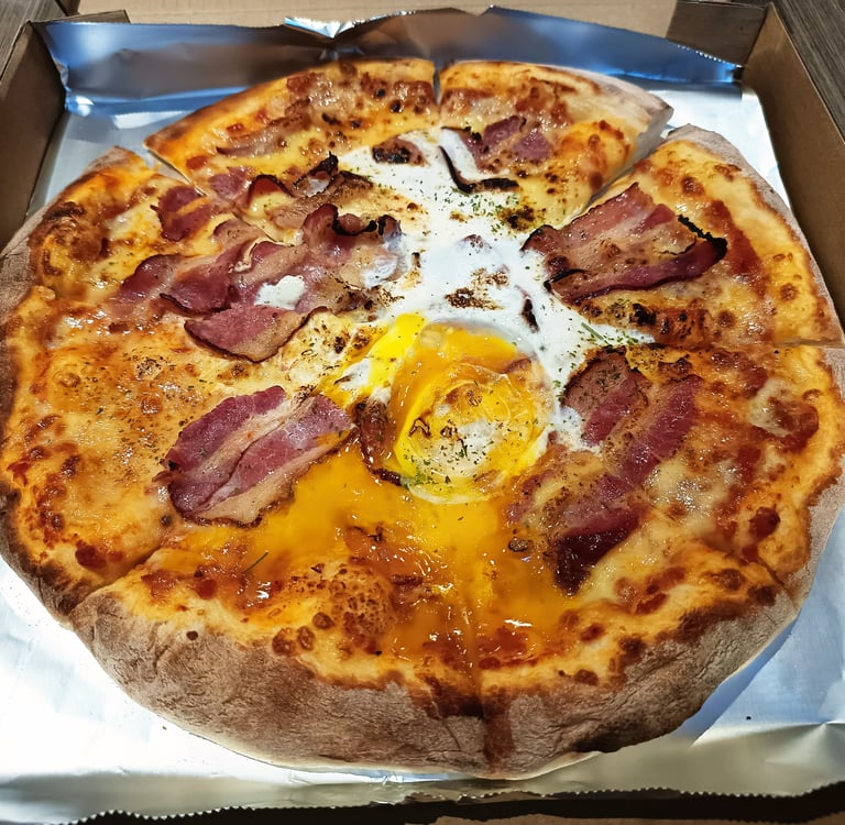 Where this pizza shines is in its toppings. The smoked bacon is plentiful and delivers a satisfying salty, savory bite that anchors the dish. The egg is the clear standout—fresh, creamy, and slightly runny, it adds richness that spreads naturally across the slice once cut.